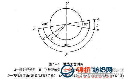 (5)為保證順利引緯,有必要將伸出噴嘴尖端的短絲伸直,需要設(shè)先行角。因此將開放壓紗器的時間比噴射開始時間作延遲,此角度即為先行角。根據(jù)緯紗的不同,通常設(shè)定為:錦綸、滌綸10°,強捻絲5°~10°,滌綸加工絲15°~20°。