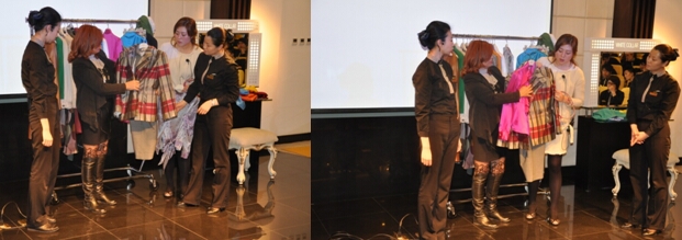 (專家親自示范如何將面料色彩與膚色相搭配)