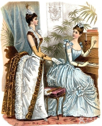 洛可可風格蓬蓬裙的襯裙外露,領口成一個大的U字型,是一種藝術上的反叛。蓬蓬裙更趨向一種精制、優(yōu)雅,低胸的款式是洛可可的強烈風格之一,曾經(jīng)被人們看作是最性感的服裝。褶裥飾邊出現(xiàn)在了蓬蓬裙上,褶裥飾邊的多與少還代表了社會上的等級制度,以及女人身上的魅力指數(shù)。