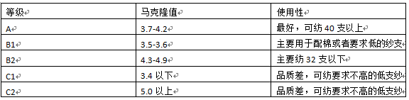 馬克隆值分為A、B、C三級(jí),B級(jí)為標(biāo)準(zhǔn)級(jí)。