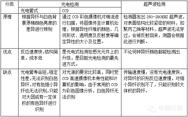 目前國(guó)內(nèi)外在清棉工序上異纖檢測(cè)有光電檢測(cè)和超聲波檢測(cè)兩大類檢測(cè)方式,其中光電式又分為光電管式、CCD二種方式,主要特點(diǎn)如下: