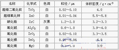 用于遠(yuǎn)紅外紡織品制備的添加劑一般都是在常溫下具有遠(yuǎn)紅外輻射功能的陶瓷微粉,粒徑通常為0.5μm 以下。這類陶瓷粉一般都是金屬氧化物或金屬碳化物,如氧化鋁、氧化鋯、氧化鎂、二氧化鈦、二氧化硅、氧化錫、碳化鋯等,表1 列出了部分遠(yuǎn)紅外陶瓷微粉的化學(xué)組成及其基本物性。