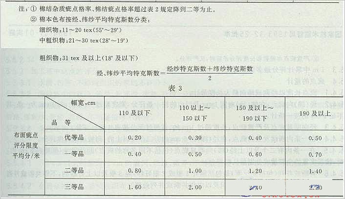 4,2.2 棉本色布的評(píng)等以匹為單位,織物組織、幅寬、布面疵點(diǎn)按匹評(píng)等,密度、斷裂強(qiáng)力、棉結(jié)雜質(zhì)疵點(diǎn)格率、棉結(jié)疵點(diǎn)格率按批評(píng)等,以其中最低的一項(xiàng)品等作為該匹布品等。