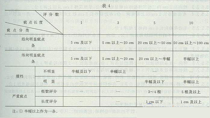 4.2.4. 4 0.5m內(nèi)半幅以上的不明顯橫檔、雙緯加合滿4條評(píng)10分為降等品.