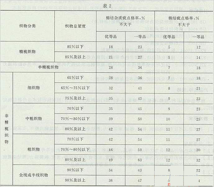 4,1 技術(shù)要求項(xiàng)目有織物組織、幅寬、密度、斷裂強(qiáng)力、棉結(jié)雜質(zhì)疵點(diǎn)格率、棉結(jié)疵點(diǎn)格率、布面疵點(diǎn)七項(xiàng)。