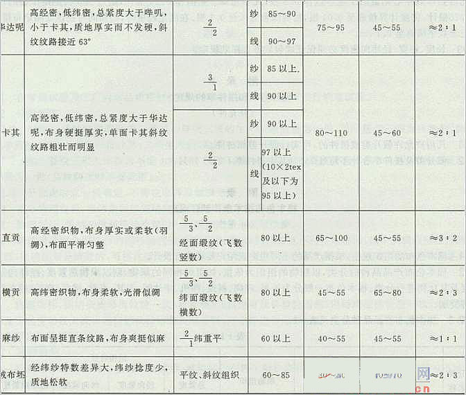 F2 棉本色布產(chǎn)品品種的分類,以織物的組織為依據(jù),如組織相同的織物,則以織物總緊度、經(jīng)緯向緊度及其比例進(jìn)行分類。棉本色布一般分為平布、府綢、斜紋、嗶嘰、華達(dá)呢、卡其、直貢、橫貢、麻紗、絨布坯等類別。