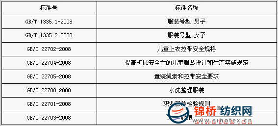 日前,國家質(zhì)量監(jiān)督檢驗(yàn)檢疫總局、國家標(biāo)準(zhǔn)化管理委員會(huì)批準(zhǔn)發(fā)布八項(xiàng)服裝類國家標(biāo)準(zhǔn),并于2009年8月1日開始實(shí)施。本批標(biāo)準(zhǔn)中有六項(xiàng)標(biāo)準(zhǔn)為最新制定的標(biāo)準(zhǔn),各相關(guān)服裝生產(chǎn)企業(yè)或銷售企業(yè)應(yīng)盡快配置新國家標(biāo)準(zhǔn),了解和跟蹤新標(biāo)準(zhǔn)的技術(shù)要求,防止因使用已廢止的標(biāo)準(zhǔn)或錯(cuò)誤標(biāo)準(zhǔn)而造成生產(chǎn)和銷售上的失誤。