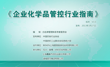 3月27日,中國印染行業(yè)協(xié)會副會長陳志華在白名單管理體系研討會上發(fā)布了《企業(yè)化學品管控行業(yè)指南》,據(jù)悉,這份文件是由中國印染行業(yè)協(xié)會、中紡聯(lián)信息統(tǒng)計部牽頭,白名單管理體系專家委員會負責編制的,其中白名單資質(zhì)企業(yè)諸城密莎集團有限公司、互太(番禺)紡織印染有限公司、上海嘉麟杰紡織品股份有限公司三家公司也參與了文件的編制工作。