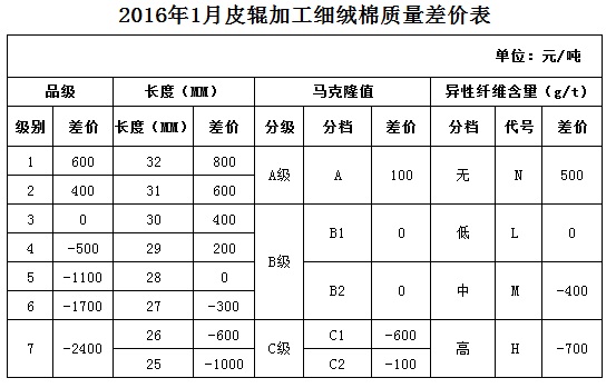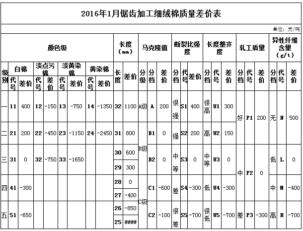 按照“優(yōu)質優(yōu)價”和紡織企業(yè)對棉花內在品質需求的原則,本月對質量差價表做了以下調整: