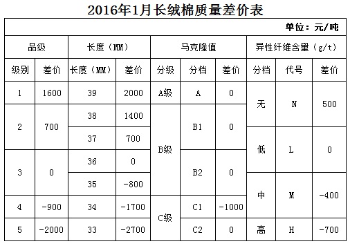 根據《中國棉花協(xié)會國產棉質量差價表定期發(fā)布辦法》的規(guī)定,現(xiàn)正式發(fā)布2016年1月《鋸齒加工細絨棉質量差價表》、《皮輥加工細絨棉質量差價表》和《長絨棉質量差價表》。