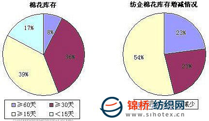 1.棉紡織企業(yè)棉花庫存情況:11月初至今CCIndex328累計上漲773元/噸,目前價位14796元/噸,而拍儲價已經(jīng)站在15000元/噸以上。對于目前的價位,多數(shù)被調(diào)查企業(yè)認(rèn)為只要棉紗價格能夠有效跟漲,15000元/噸還是可以接受的。但是囤棉對于多數(shù)企業(yè)來說還不大現(xiàn)實,隨用隨買仍然是主流。被調(diào)查企業(yè)中,54%減少棉花庫存,23%增加棉花庫存;平均棉花庫存由10月底的34.12天減少至11月底的33.43天,折合棉花工業(yè)庫存量由105.90萬噸減少至104.65萬噸。