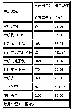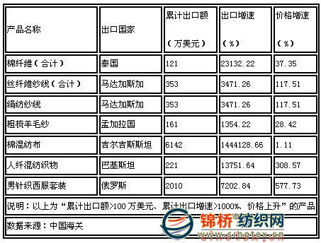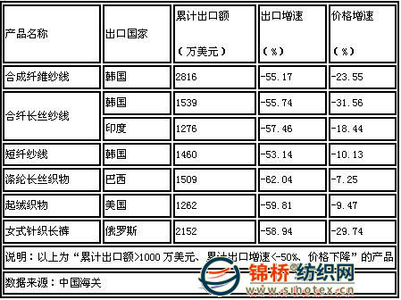 抓住機遇避風險 在整體出口不振的情況下,以輸往韓國合成纖維紗線為代表的一批產(chǎn)品,市場萎縮尤其嚴重。出口增速為-50%以下,價格下跌,對于超千萬市場而言,無疑是巨大下滑。 當然,并非所有的產(chǎn)品、市場都令人沮喪。圖3中1~2月出口額超100萬美元、出口較上年增長10倍以上、價格還有所上升的產(chǎn)品也是各行業(yè)都有所涉及。盡管旺銷的市場主要集中在發(fā)展中國家,但同時也意味著紡織產(chǎn)品具有更大的增長空間。 圖2 暴跌的市場