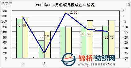 【錦橋專稿】海關(guān)統(tǒng)計(jì)資料顯示,2009年5月,我國紡織品服裝出口123.06億美元,同比下降14.7%,環(huán)比4月下降1.5%。其中紡織品出口48.95億美元,分別下降16.3%和4.4%;服裝出口74.11億美元,同比下降13.7%,環(huán)比微升0.5%。