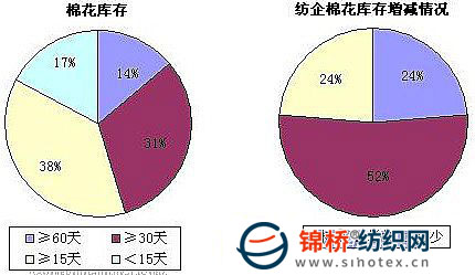 1.棉紡企業(yè)棉花庫存情況:鑒于目前現(xiàn)貨市場棉價強勢,多數(shù)企業(yè)購棉保持理性,1個月左右?guī)齑嫠奖容^普遍,少數(shù)企業(yè)年前大量采購棉花,目前企業(yè)庫存充裕。由于市場需求原因,目前棉織物需求增加,企業(yè)棉花用量在所有原料中所占比重有所提高。被調查企業(yè)中,24%減少棉花庫存,52%增加棉花庫存;平均棉花庫存35.77天,折合棉花工業(yè)庫存量112.78萬噸。