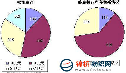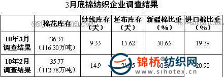 注:工業(yè)庫存調(diào)查結(jié)果僅包括棉紡織企業(yè)已經(jīng)入庫棉花庫存。 1.棉紡織企業(yè)棉花庫存情況:3月以來國內(nèi)、外棉花價(jià)格連創(chuàng)新高,多數(shù)被調(diào)查紡織企業(yè)出于價(jià)格風(fēng)險(xiǎn)考慮,沒有明顯增加原料庫存,大多依然維持1個(gè)月左右的庫存水平。被調(diào)查企業(yè)中,28%減少棉花庫存,61%增加棉花庫存;平均棉花庫存由上月的35.77天增加至36.51天,折合棉花工業(yè)庫存量由112.78萬噸增加至116.30萬噸。 對于后期棉花價(jià)格走勢,部分企業(yè)認(rèn)為已經(jīng)接近頂點(diǎn),上下都有難度;也有企業(yè)認(rèn)為供需矛盾后期將日益突出,棉花價(jià)格仍然將上漲,但是幅度和速度將有所減緩。