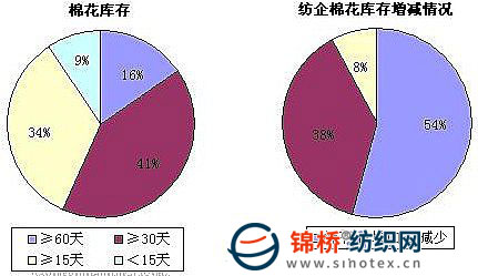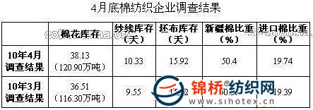 注:工業(yè)庫存調(diào)查結(jié)果僅包括棉紡企已入庫棉花庫存。 1.棉紡企業(yè)棉花庫存情況:4月以來現(xiàn)貨市場棉價持續(xù)上行,國內(nèi)多數(shù)被調(diào)查企業(yè)已經(jīng)被幾個月來上漲行情所折服,在控制風(fēng)險前提下盡量增加庫存量。極少數(shù)上規(guī)模、高效益的紡企棉花庫存甚至已經(jīng)能和新棉接軌。被調(diào)查企業(yè)中,8%減少棉花庫存,38%增加棉花庫存;平均棉花庫存由上月的36.51天增加至38.13天,折合棉花工業(yè)庫存量由116.30萬噸增加至120.90萬噸。 對于后期棉價走勢,多數(shù)被調(diào)查企業(yè)持看漲觀點。也有企業(yè)表示,2010年極端天氣頻繁,雜糧、大蒜等農(nóng)產(chǎn)品價格普遍上漲,棉價也將水漲船高。