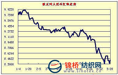 今年來,受歐洲債務(wù)危機(jī)影響,歐元持續(xù)大幅貶值,歐元對(duì)人民幣由1:9.922下降至5月末的8.424,累計(jì)下降15.1%,其中今年3-5月下降10%。今年來歐元對(duì)人民幣走勢(shì)如下: