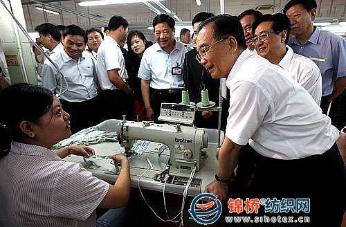 6月25日,溫家寶在杭州祥潤(rùn)制衣有限公司生產(chǎn)車間與工人交談。
