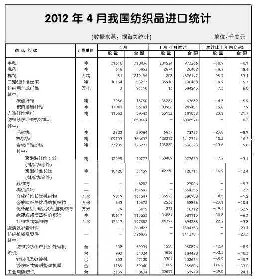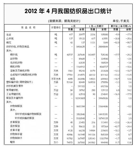 據(jù)海關(guān)統(tǒng)計(jì),今年4月,我國(guó)紡織品服裝進(jìn)出口貿(mào)易額207.1億美元,同比下降5%。其中,出口188億美元,同比下降5.4%;進(jìn)口19.1億美元,同比下降1%。當(dāng)月順差168.9億美元,下降5.8%。1~4月,我國(guó)紡織品服裝累計(jì)進(jìn)出口貿(mào)易額761.3億美元,增長(zhǎng)0.7%。其中,出口688.2億美元,增長(zhǎng)0.5%;進(jìn)口73.1億美元,增長(zhǎng)3.3%。累計(jì)順差615.1億美元,與去年同期基本持平。 4月,在國(guó)內(nèi)經(jīng)濟(jì)繼續(xù)放緩、主要市場(chǎng)需求持續(xù)疲軟的情況下,紡織品服裝進(jìn)口、出口全面下降,當(dāng)月貿(mào)易額下降5%,創(chuàng)年初以來(lái)最大單月降幅。 1~4月,紡織品服裝出口基本持平,進(jìn)口小幅增長(zhǎng)。進(jìn)、出口增幅均低于全國(guó)貨物貿(mào)易總體水平。目前來(lái)看,紡織品服裝進(jìn)、出口短期內(nèi)難以實(shí)現(xiàn)回暖,貿(mào)易前景不容樂(lè)觀。 主要出口市場(chǎng)單價(jià)回落明顯 歐盟市場(chǎng):作為我國(guó)紡織品服裝最大的出口市場(chǎng),歐盟市場(chǎng)的表現(xiàn)一直不佳。我國(guó)對(duì)歐盟出口在今年3月出現(xiàn)短暫反彈后,于4月再度下降。4月出口29.1億美元,下降19%。其中紡織品下降7%,服裝下降24.3%,服裝中,針織、梭織服裝出口量均下降,出口單價(jià)跌至年內(nèi)最低。 1~4月,我對(duì)歐盟累計(jì)出口123.4億美元,下降11.1%,其中紡織品下降4.7%,服裝下降13.5%。 美國(guó)市場(chǎng):4月,我對(duì)美國(guó)出口27.4億美元,受服裝出口下降拖累,同比僅增長(zhǎng)0.3%。針織、梭織服裝出口量當(dāng)月下降1.9%,出口單價(jià)逐步走低,當(dāng)月降至3.72美元/件(套),降幅擴(kuò)大至4.8%。1~4月,我對(duì)美紡織品服裝出口102.3億美元,增長(zhǎng)7.9%,增幅高于對(duì)全球出口水平。其中紡織品出口30.6億美元,增長(zhǎng)12.1%,服裝出口71.7億美元,增長(zhǎng)6.2%。出口單價(jià)增勢(shì)不再。 日本市場(chǎng):對(duì)日出口年內(nèi)首降,服裝出口單價(jià)持續(xù)回落。4月,我對(duì)日本出口23.5億美元,自去年2月以來(lái)首次下降,降幅為2.6%。其中紡織品下降2.5%,服裝下降2.6%。出口單價(jià)逐月回落,4月降至5.23美元/件(套)的年內(nèi)低點(diǎn)。1~4月,我對(duì)日本紡織品服裝出口86.3億美元,增長(zhǎng)4.7%。其中紡織品增長(zhǎng)4.1%,服裝增長(zhǎng)4.8%。主要出口商品針織梭織服裝出口量下降3.7%,出口單價(jià)上漲8%。 對(duì)東盟多國(guó)出口增幅超20% 東盟市場(chǎng)方面,當(dāng)月出口增速大幅回落,紗線面料出口驟降。4月,我國(guó)對(duì)東盟出口19.9億美元,增長(zhǎng)5%,增幅較3月回落31.3個(gè)百分點(diǎn)。其中紗線和面料在2月及3月的出口均保持20%以上的增長(zhǎng),4月出口驟然下降5.2%。1~4月,我對(duì)東盟出口65.7億美元,增長(zhǎng)14.6%,其中,紗線和面料出口合計(jì)35.8億美元,增長(zhǎng)4.5%。紗線、面料出口量分別增長(zhǎng)30.5%和6.5%,出口單價(jià)分別下降10%和3.7%。盡管增速回落,東盟仍是我紡織品服裝出口增長(zhǎng)的主要市場(chǎng),前4個(gè)月,我對(duì)東盟各國(guó)(除新加坡外)累計(jì)出口全面實(shí)現(xiàn)增長(zhǎng),其中對(duì)越南、馬來(lái)西亞、菲律賓、文萊和老撾的出口增幅均超過(guò)20%。 東部省區(qū)出口下降明顯 今年4月,我國(guó)近2/3的省、直轄市、自治區(qū)出口下降,其中前五大出口省市出口全部下降,這種現(xiàn)象年內(nèi)首次出現(xiàn)。進(jìn)口方面,進(jìn)口大省廣東、江蘇和上海市全部下降,降幅分別為4.5%、9.1%和2.1%。 1~4月,全國(guó)近一半的省、直轄市、自治區(qū)出口下降。前五大出口省市中,廣東、江蘇和山東均下降,浙江、上海依然保持增長(zhǎng)。從地理分布上看,東部地區(qū)成為下降“重災(zāi)區(qū)”,近2/3的東部省區(qū)出口下降;中西部相對(duì)略好,只有1/3的省區(qū)出口下降,其中部分地區(qū),如廣西、重慶、內(nèi)蒙古、西藏等地出口增長(zhǎng)迅速。 4月紡織品服裝出口量?jī)r(jià)齊跌 4月,紡織品、服裝出口年內(nèi)首次全部下降,降幅分別為4.1%和6.4%。主要出口產(chǎn)品中,紗線量、價(jià)齊跌致出口額下降19.4%,面料、針織及梭織服裝則分別由于出口單價(jià)下跌和出口量下降導(dǎo)致出口額下降5.7%和8.3%。針織及梭織服裝的出口單價(jià)自1月以來(lái)逐月回落,4月降至3.82美元/件(套),比1月下降10.3%。 年初以來(lái),紡織品和服裝兩大類(lèi)產(chǎn)品的出口均沒(méi)有明顯起色。1~4月,紡織品累計(jì)出口288.5億美元,下降0.3%,服裝出口399.7億美元,僅增長(zhǎng)1%。紡織品中只有制成品實(shí)現(xiàn)6.5%的增長(zhǎng),紗線、面料則分別下降16.5%和0.3%。服裝中,針織、梭織服裝出口量下降5.8%,出口額下降0.1%。 服裝進(jìn)口量?jī)r(jià)齊升 4月,我國(guó)紡織品進(jìn)口16.5億美元,同比、環(huán)比分別下降1.8%和6.3%。從進(jìn)口額看,紗線進(jìn)口增長(zhǎng)15.6%,面料下降12.7%。但從量?jī)r(jià)分析,紗線進(jìn)口量雖然仍實(shí)現(xiàn)同比增長(zhǎng),但較前期明顯縮減;面料進(jìn)口量則創(chuàng)下年內(nèi)新高,進(jìn)口額下降主要受單價(jià)下跌影響。服裝當(dāng)月進(jìn)口2.6億美元,增長(zhǎng)4.4%,其中針織和梭織服裝進(jìn)口量增長(zhǎng)9.8%,進(jìn)口單價(jià)年內(nèi)首次下降4.4%。
