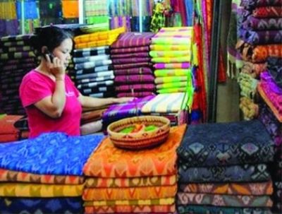 “安代克”是巴厘島特有編織工藝,制作過程復(fù)雜,緯線先要染色,再織入素色的經(jīng)線,從染色到紡織,全部人工作業(yè)。布料特色為抽象圖案,亮麗顏色。成品“安代克”在當(dāng)?shù)貎r(jià)格不菲,平均1尺布料價(jià)格大約3萬至10萬印尼盾(約合2.6至8.7美元)。