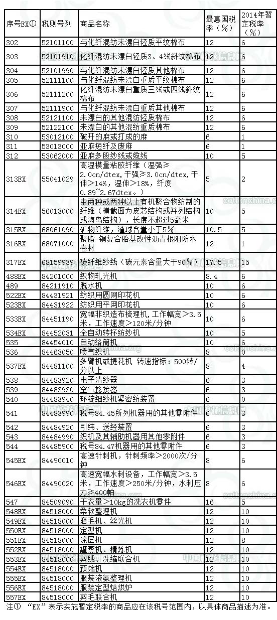 2014年部分紡織產(chǎn)品和紡織機(jī)械類產(chǎn)品進(jìn)口關(guān)稅暫定稅率表