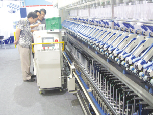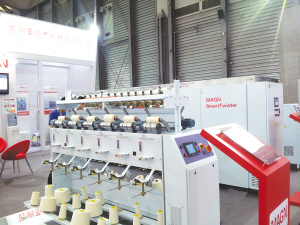 本屆展會(huì),青島宏大紡織機(jī)械有限責(zé)任公司展出了SMARO-E托盤式自動(dòng)絡(luò)筒機(jī)。該設(shè)備是青島宏大紡機(jī)公司開發(fā)設(shè)計(jì)的一款新型自動(dòng)絡(luò)筒機(jī),繼承了SMARO自動(dòng)絡(luò)筒機(jī)及SMARO-I細(xì)絡(luò)聯(lián)型自動(dòng)絡(luò)筒機(jī)的優(yōu)點(diǎn),優(yōu)化設(shè)計(jì)了管紗處理及單錠換管機(jī)構(gòu),增加了大紗庫(kù),取消了與細(xì)紗機(jī)的剛性連接,對(duì)品種的適應(yīng)性更好,采用了先進(jìn)的控制技術(shù),實(shí)現(xiàn)了自診斷自供給全程監(jiān)控功能,大大提高了設(shè)備的自動(dòng)化和智能化程度。 SMARO-E托盤式自動(dòng)絡(luò)筒機(jī)使用大紗庫(kù)喂紗,可大幅減少用工,管紗由翻斗按需供給,完全取代了人工單個(gè)單錠供紗,整個(gè)過程實(shí)現(xiàn)自動(dòng)化、連續(xù)化生產(chǎn),提高了勞動(dòng)生產(chǎn)率,同普通紗庫(kù)形式的自動(dòng)絡(luò)筒機(jī)相比可減少70%用工。 此外,管紗輸送增強(qiáng)了多通道邏輯判斷,使得管紗處理對(duì)滿管、空管、生頭、再生頭拔管等動(dòng)作時(shí),互不干擾,做到有序運(yùn)行。采用的傳感器在線檢測(cè)反饋技術(shù),可根據(jù)系統(tǒng)內(nèi)管紗的存量自動(dòng)調(diào)整供給量,自動(dòng)啟動(dòng)振動(dòng)輸送及管紗喂給,最大限度地實(shí)現(xiàn)了自動(dòng)化程度和靈活性。人機(jī)界面采用四級(jí)菜單顯示,傳感器采集數(shù)據(jù),上位機(jī)情景顯示故障精確位置,實(shí)時(shí)監(jiān)測(cè)紗線運(yùn)行情況,滿足高端用戶生產(chǎn)管理要求。