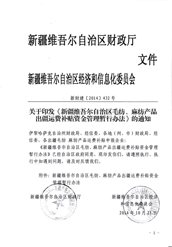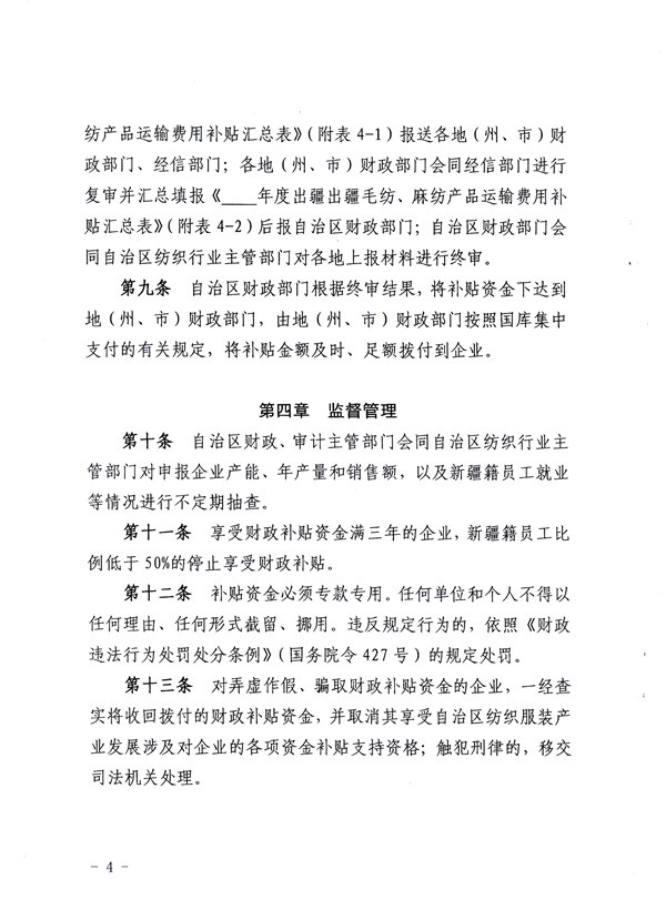 << 《新疆維吾爾自治區(qū)紡織企業(yè)使用新疆地產(chǎn)棉補(bǔ)貼資金管理暫行辦法》《新疆維吾爾自治區(qū)服裝 家紡等紡織深加工產(chǎn)品出疆運(yùn)費(fèi)補(bǔ)貼資金管理暫行辦法》 >>