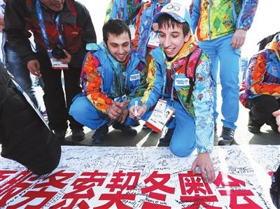 志愿者身穿由華陽(yáng)生產(chǎn)的面料制作的服裝,在索契奧林匹克公園舉行“志愿服務(wù)索契冬奧會(huì)助力北京申辦2022年冬奧會(huì)”簽名活動(dòng)