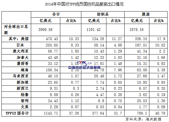 2014年我國對TPP12國出口紡織品服裝共1143.71億美元,其中紡織品377.64億美元,服裝766.10億美元。分別占我國紡織品服裝出口額的37.26%,紡織品出口額的31.70%,服裝出口額的40.79%。