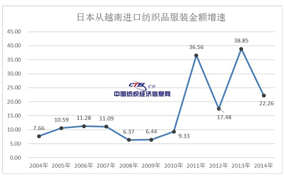 日本與越南2008年末簽署了自貿(mào)協(xié)議,2009年7月開始正式實施,并對越南紡織品服裝進口逐步施行零關稅。從2011年起,越南對日本紡織品服裝出口開始大幅增長。2014年金額已達3401億日元,比2009年增長1.98倍。零關稅的刺激作用明顯。