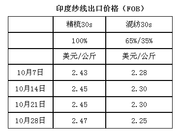 由于棉花價格保持在低位,印度紗廠的利潤一直不錯。進(jìn)入11月,隨著新棉上市量的增加,印度棉花價格繼續(xù)看跌,棉紗價格也會隨之下跌。滌短、滌綸紗和滌棉紗的價格可能也會走低。