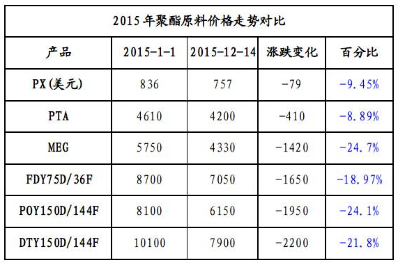 在過去一年時間里,在國際油價大幅回落背景下,紡織化纖原材料大幅回落,國內(nèi)大宗紡織原料商品市場一片萎靡、跌多漲少,很多企業(yè)老總感嘆就像是坐了一趟過山車。