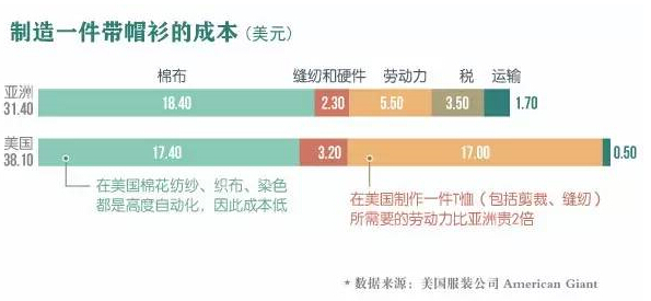 從制造一件帶帽衫的實際成本可以看出,美國與亞洲國家的差距已經不大。