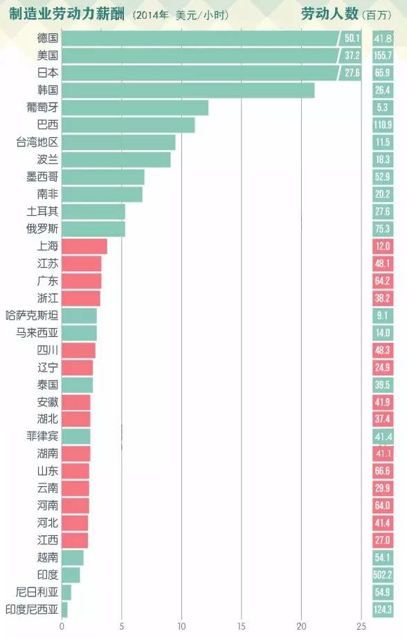 按照目前國內工人工資上漲趨勢,如考慮國內5年工資再翻倍、10年工資翻兩番計算,那么中國在人工成本上也占不到任何優(yōu)勢了。