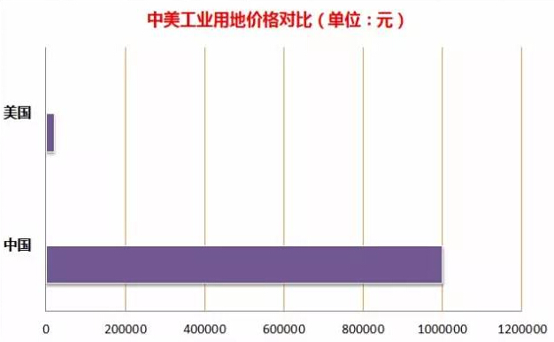 國內二線城市工業(yè)用地成交價格在50-150萬元左右,而以杭州市為例,目前前美國工業(yè)用地價僅為2萬美元/英畝,相當于2萬元人民幣/畝,如果按照現(xiàn)在許多縣城工業(yè)用地100萬元/畝算,成本是美國的50倍。