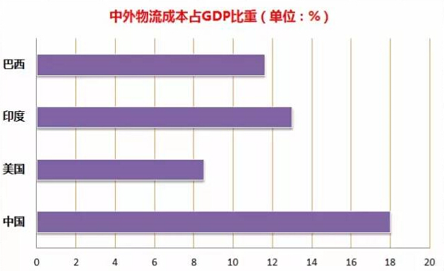 2013年我國社會物流費用占gdp比重為18.0%,是美國8.5%的2倍有余,同期印度為為13.0%。巴西為11.6%。以油價為例,2015年12月,美國平均油價為2.7元,中國油價是美國的2倍,油價高,物流成本也就高。何況中國還有全世界少有的過路費、過橋費,物流成本能不高么?