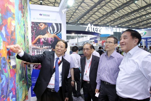 中國紡織聯(lián)合會會長王天凱(右1)上海紡織(集團(tuán))公司總裁朱勇(右2)仔細(xì)觀看展出的數(shù)碼印花面料精品。這些面料都是采用宏華數(shù)碼印花機(jī)印制的