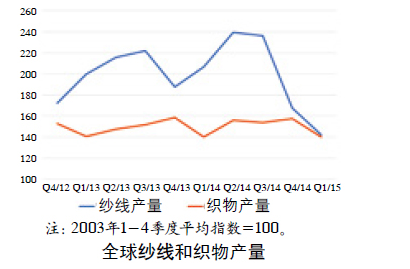 2015年1季度,全球織物產(chǎn)量的環(huán)比下降11%。其中,亞洲和歐洲分別下降了12%和5%。全球織物產(chǎn)量同比持平。其中亞洲的產(chǎn)量攀升了1.5%,歐洲的產(chǎn)量則下降了7.8%。