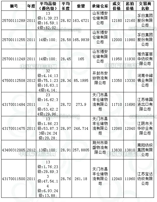 2011年度國(guó)產(chǎn)棉最高成交價(jià):12180元/噸,最低成交價(jià):11710元/噸,平均成交價(jià):11990元/噸,折3128B價(jià)13230元/噸。平均長(zhǎng)度28.6。
