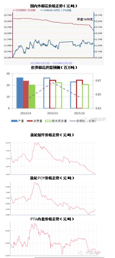 2016年,全球棉花市場(chǎng)供大于求的基本面仍未改變,庫(kù)存量繼續(xù)擴(kuò)大,加上美元升值影響,國(guó)際棉價(jià)相較于2015年將處于相對(duì)低位區(qū)間。