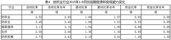 從短期償債和變現(xiàn)能力的變化看,紡織全行業(yè)流動(dòng)比率(流動(dòng)資產(chǎn)/流動(dòng)負(fù)債)2015年1-9月份為2.52倍,而上年同期為2.50倍,流動(dòng)比率較高,表明企業(yè)短期償債能力較強(qiáng);