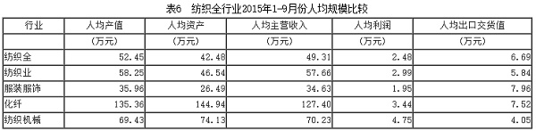 從企業(yè)平均規(guī)模的比較看,2015年1-9月份紡織全行業(yè)的企業(yè)平均產(chǎn)值為13976萬(wàn)元,其中紡織行業(yè)企業(yè)平均產(chǎn)值為14061萬(wàn)元,為紡織全行業(yè)平均數(shù)的1.006倍;服裝服飾行業(yè)為10457萬(wàn)元,為紡織全行業(yè)平均數(shù)的0.75倍;化纖行業(yè)為33706萬(wàn)元,為行業(yè)平均數(shù)的2.41倍;紡織機(jī)械行業(yè)為12805萬(wàn)元,為行業(yè)平均數(shù)的0.92倍,表明化纖行業(yè)的企業(yè)平均規(guī)模較大,而服裝服飾等行業(yè)的企業(yè)平均規(guī)模較小一些。