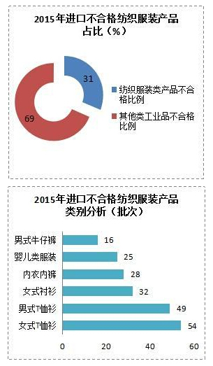根據(jù)質(zhì)檢總局發(fā)布的信息,1158批進(jìn)口不合格工業(yè)品中包含紡織服裝類產(chǎn)品361批,占總不合格批次的31.2%,其中女式T恤衫等6類進(jìn)口產(chǎn)品分列不合格批次量前六。