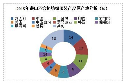 意大利、中國、土耳其、印度、孟加拉和美國是2015年不合格進(jìn)口紡織服裝產(chǎn)品的主要來源地,六國共貢獻(xiàn)了60%的不合格率。