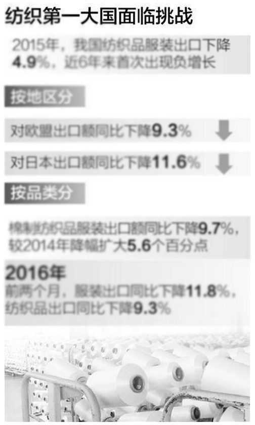 猴年已入春,紡織業(yè)的寒冬仍未過去。去年,我國(guó)紡織品服裝出口下降了4.9%,近6年來(lái)首次出現(xiàn)負(fù)增長(zhǎng)。今年前兩月,出口降幅繼續(xù)擴(kuò)大,服裝出口下降11.8%,紡織品出口下降9.3%。