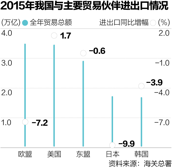 海關(guān)總署的數(shù)據(jù)顯示,2015年,我國進出口總值24.58萬億元人民幣,同比下降7%。其中,出口下降1.8%;進口下降13.2%。去年我國紡織服裝出口2837.8億美元,同比下降了4.9%。