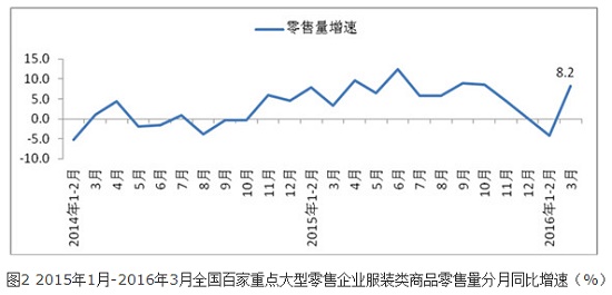 2016年一季度全國百家重點(diǎn)大型零售企業(yè)各類服裝銷量同比下降0.5%,增速低于上年同期6.4個(gè)百分點(diǎn),其中,3月份服裝零售量同比增長8.2%,增速較上年同期高4.9個(gè)百分點(diǎn)。