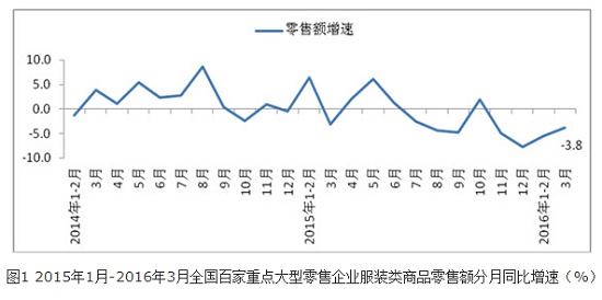 根據(jù)中華全國商業(yè)信息中心的統(tǒng)計(jì)數(shù)據(jù),2016年一季度全國百家重點(diǎn)大型零售企業(yè)服裝類商品零售額同比下降5.1%,增速較上年同期低9.0個(gè)百分點(diǎn)。其中,3月份零售額同比下降3.8%,降幅較上年同月擴(kuò)大0.7個(gè)百分點(diǎn)。