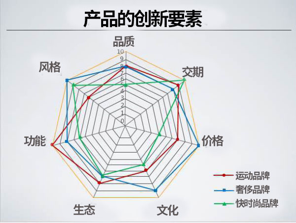 李斌紅表示,在需求快速增長的 “十一五”時(shí)期和“十二五”前期,品質(zhì)、交期和價(jià)格三個(gè)要素基本能夠決定產(chǎn)品的成交。但在“新常態(tài)”下,市場競爭和消費(fèi)需求的變化對產(chǎn)品要素產(chǎn)生深刻影響:更加多元化的產(chǎn)品風(fēng)格和功能,以及生態(tài)、文化等要素在產(chǎn)品成交中發(fā)揮越來越大的作用。她用一張簡潔明了的“雷達(dá)圖”解釋了不同品牌和不同市場定位的企業(yè)(運(yùn)動(dòng)品牌、快時(shí)尚品牌和奢侈品牌)對產(chǎn)品創(chuàng)新要素的不同側(cè)重。