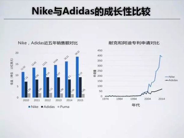 李斌紅主任還結(jié)合Nike公司產(chǎn)品創(chuàng)新的“基因”進(jìn)行了深入分析。在2015年發(fā)布的《全球品牌榜》中,Nike以297.17億美元的品牌價(jià)值位列服裝類品牌首位,而相比此前與其勢均力敵的競爭伙伴Adidas,Nike正是通過科技驅(qū)動(dòng)創(chuàng)新獲得了可持續(xù)的增長和絕對的優(yōu)勢。10年來,Nike的專利技術(shù)爆發(fā)式增長,隨之而來的是其不斷由技術(shù)推動(dòng)的產(chǎn)品創(chuàng)新。